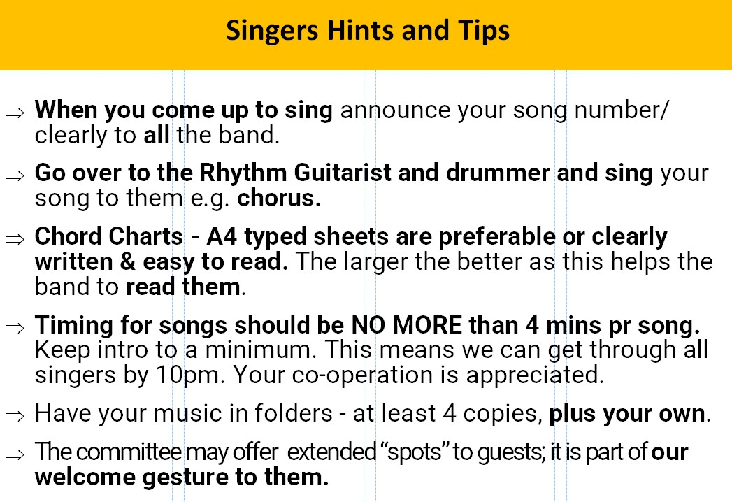 Singers bring their own chord sheets – 4 sets for Band + their own set, and they give their name to MC.